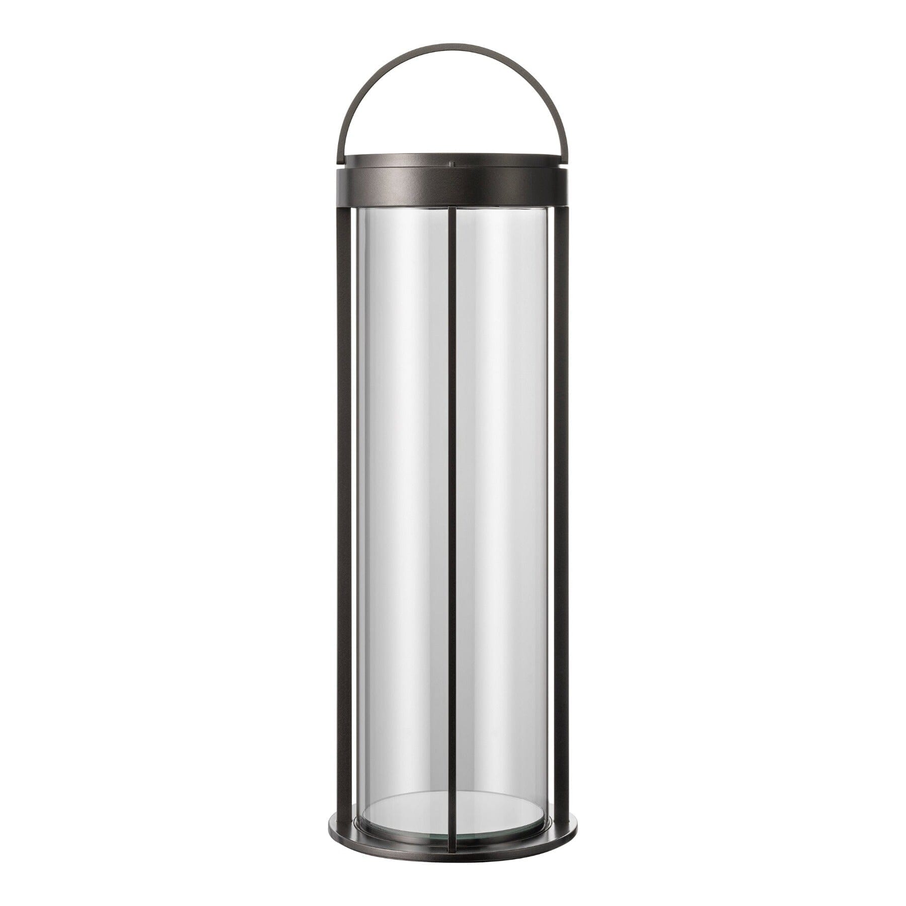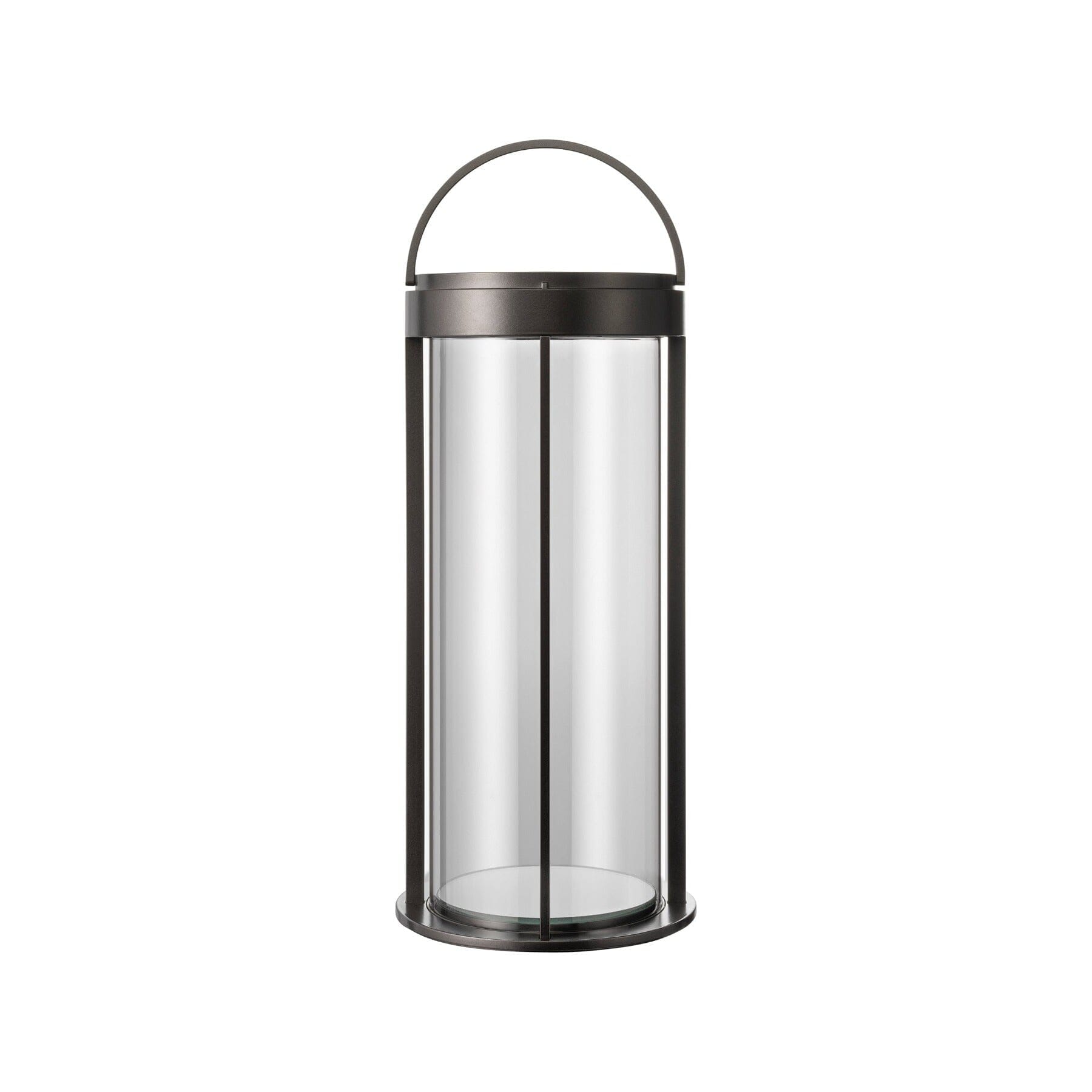 Gunmetal metallic aluminum body encloses a darkened glass tube which emits light all around the cylinder. Integrated, discreet handle ads to mobility. Extremely water resistant. Operated with a touch-button at top of the lamp.