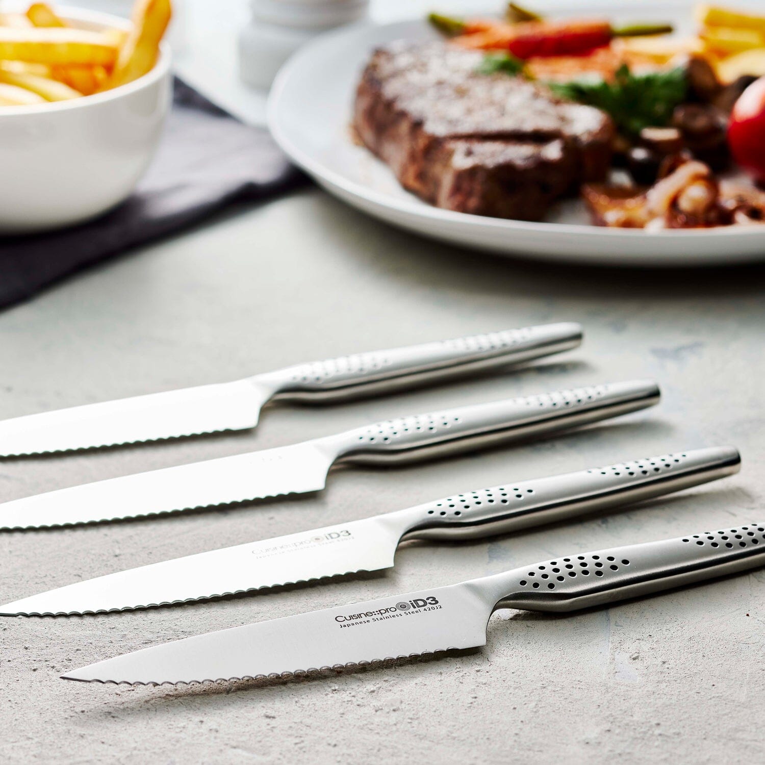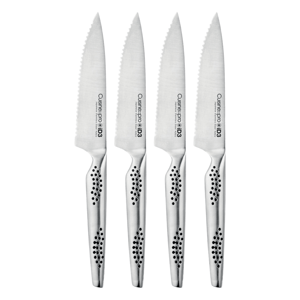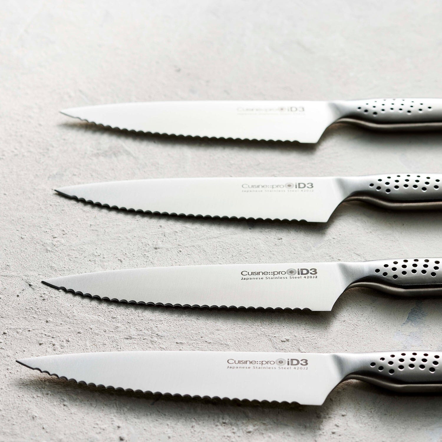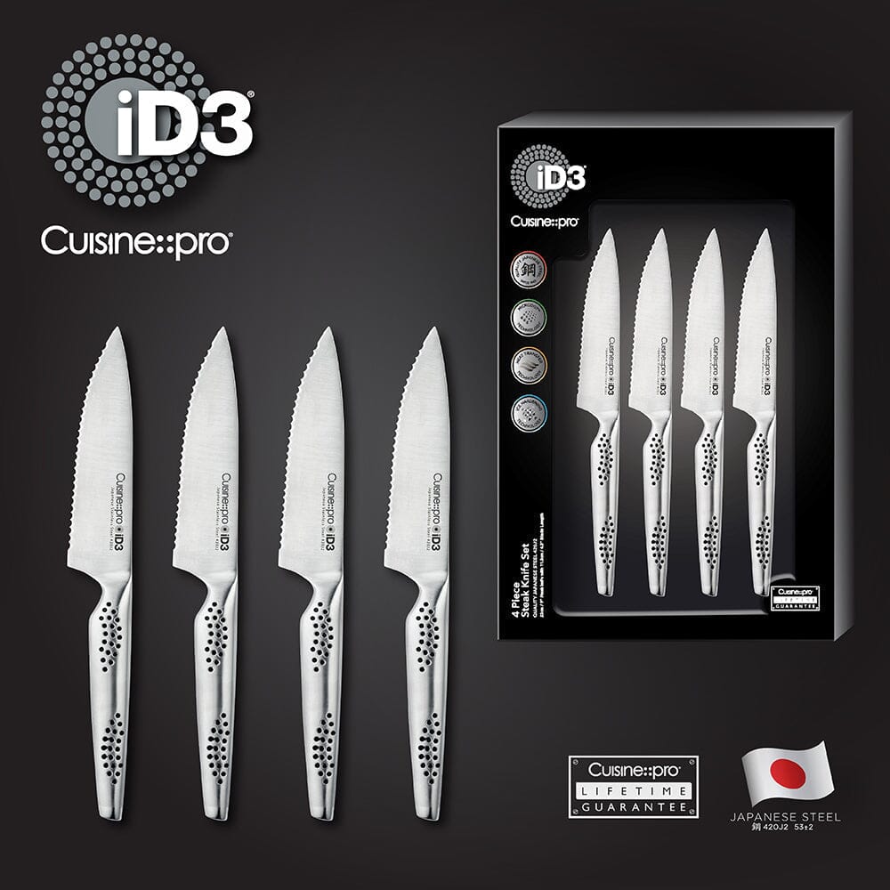 The Cuisine::pro® iD3® 4-piece steak knife set is perfect whether you're having a casual family dinner or entertaining friends at home. These knives are made from the finest quality Japanese stainless steel for unrivaled strength, sharpness, and durability.