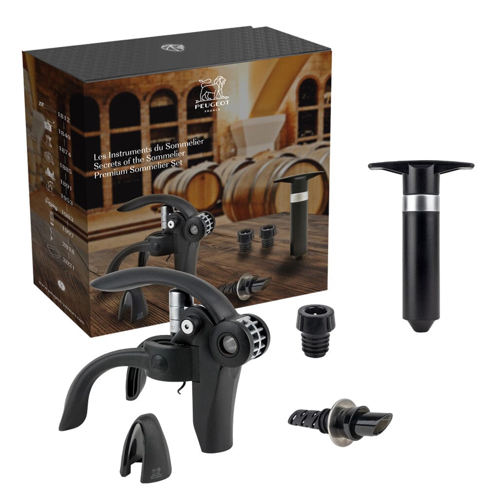 Peugeot offers a comprehensive wine kit for opening, serving, and preserving bottles in an elegant gift box. The kit includes a foil cutter and the Baltaz lever corkscrew, which features a unique trigger handle for effortless one-handed bottle opening. The Aros spout allows drip-free pouring while oxygenating the wine, and a vacuum pump helps extend the wine's life by sealing the bottle. This versatile kit combines style and functionality, making wine enjoyment convenient and sophisticated.