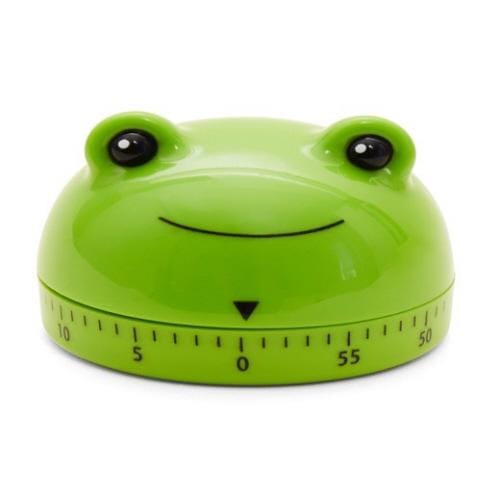 Infuse a touch of natural whimsy into your kitchen with this charming froggy timer. Designed to keep track of cooking time in convenient one-minute increments for up to sixty minutes, it adds a delightful flair to your culinary routine. Forget about batteries – simply hand wind the clock, and a pleasant ding will joyfully announce when your eggs are perfectly done.