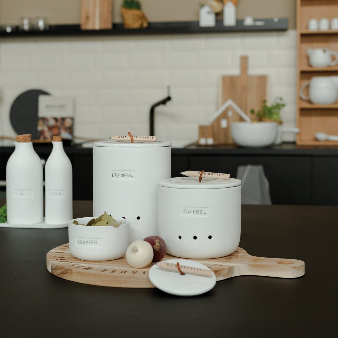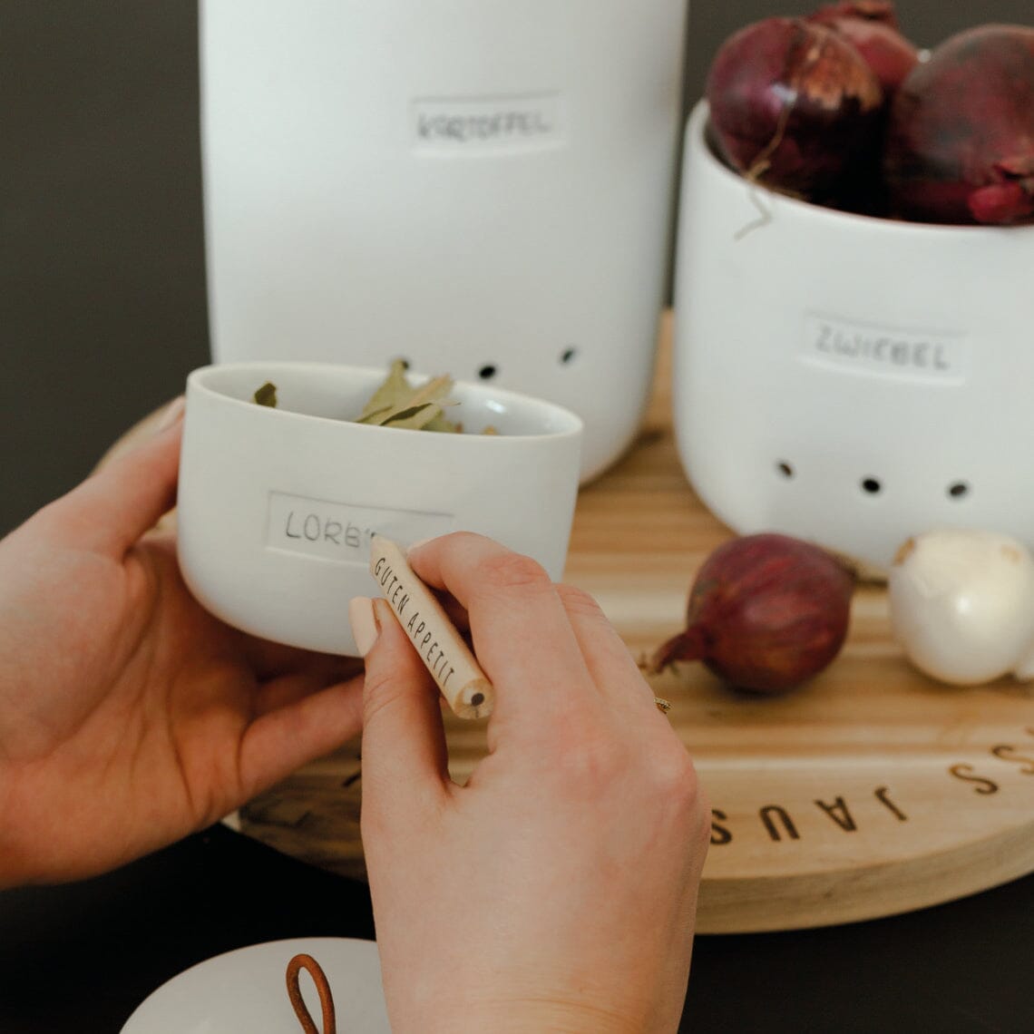 The Rader Bon Appetit canister set features 3 beautiful and practical porcelain canisters - perfect for storing smaller items in your kitchen beautifully. The canisters are glazed on the inside and unglazed on the outside. Each lid features a beautiful leather loop for attaching a pencil so you can label the canister. One pencil is included with each canister. Larger sizes feature air vents. These canisters are perfect for storing tea leaves, garlic cloves or a secret stash of chocolates.