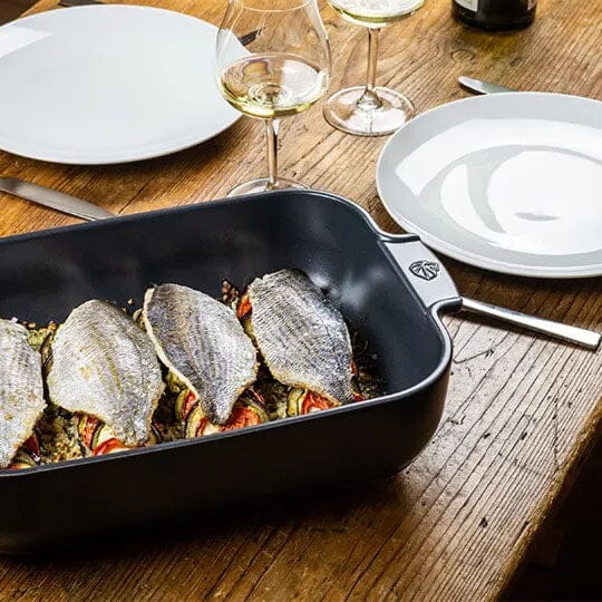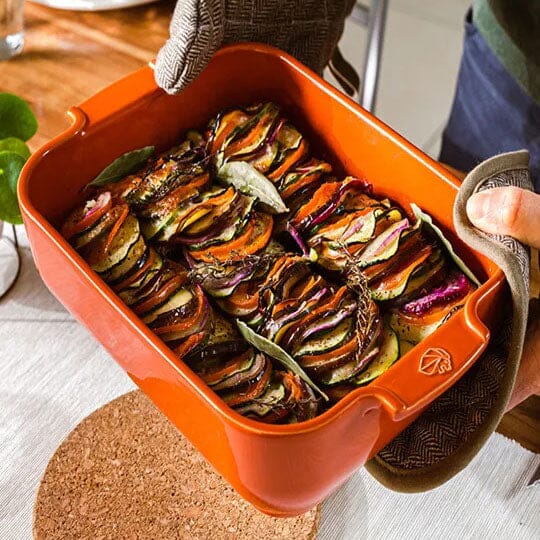 We recommend using the 16" size for cooking generous gratins or vegetable tians serving 6-8, 12" size dishes to effortlessly serve 4-6 people from oven to table, and a more compact 10" size for smaller baked goods and more intimate meals. These ceramic dishes come in a variety of colors: choose from saffron or terracotta for a bright, warm decorative touch, slate or satin black for a contemporary light satin color, or ecru for classic aesthetics to match comforting slow cooked meals.