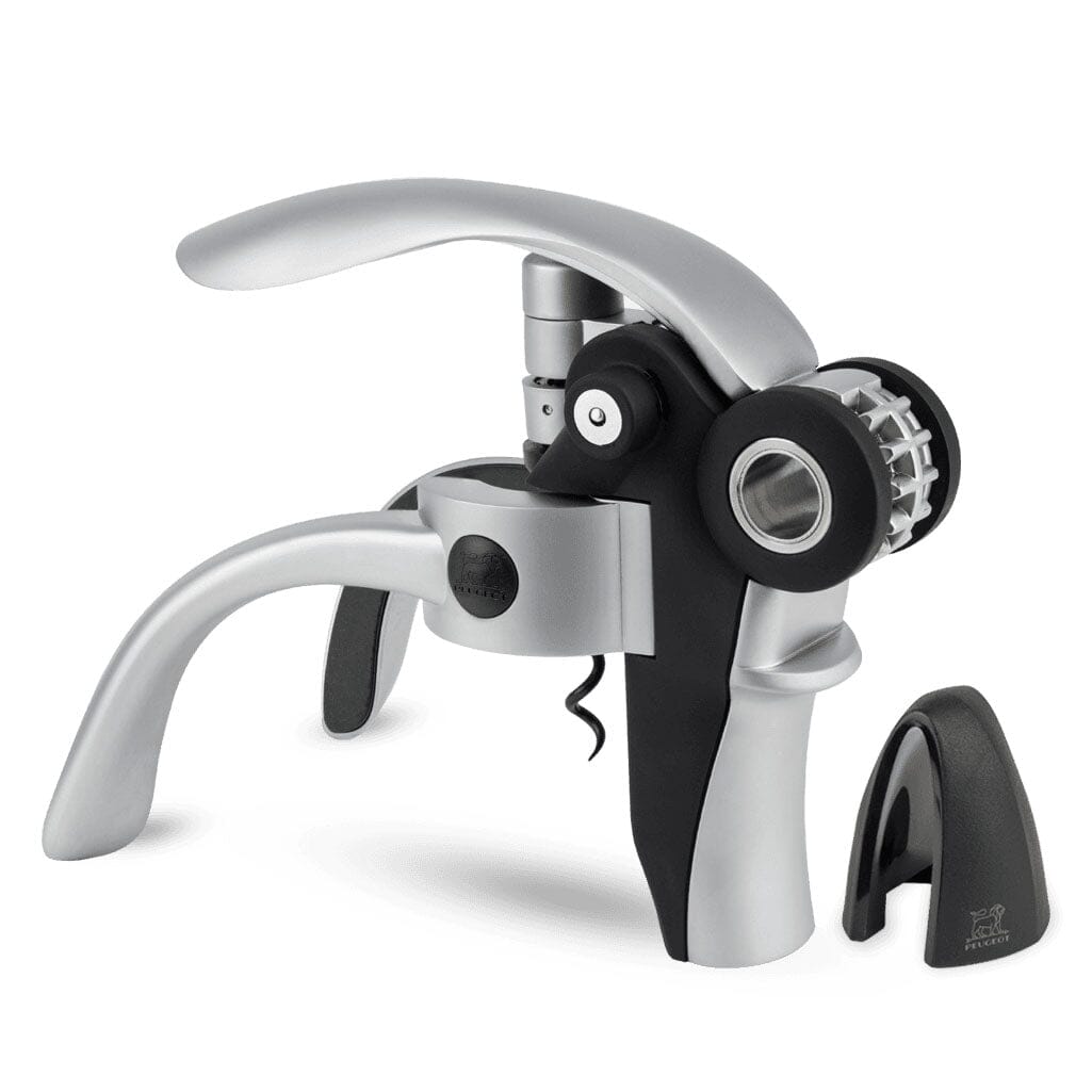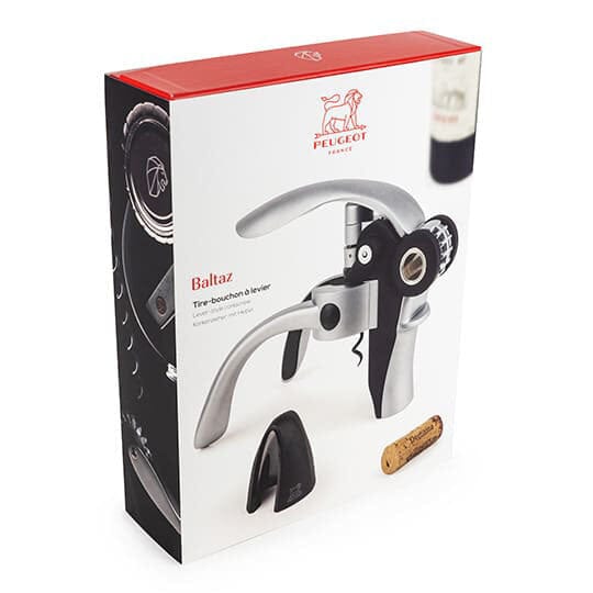 Peugeot Saveurs' Baltaz corkscrew combines easy handling, effectiveness, and design. This lever-style corkscrew includes a foil-cutter and its handles hold your bottle firmly in place as you effortlessly extract the cork. Peugeot’s engineering heritage results in an expertly crafted tool with a precise mechanism. It is ergonomically designed for perfect handling, will fit any bottle, and features a contemporary design in matte shades of black and silver.