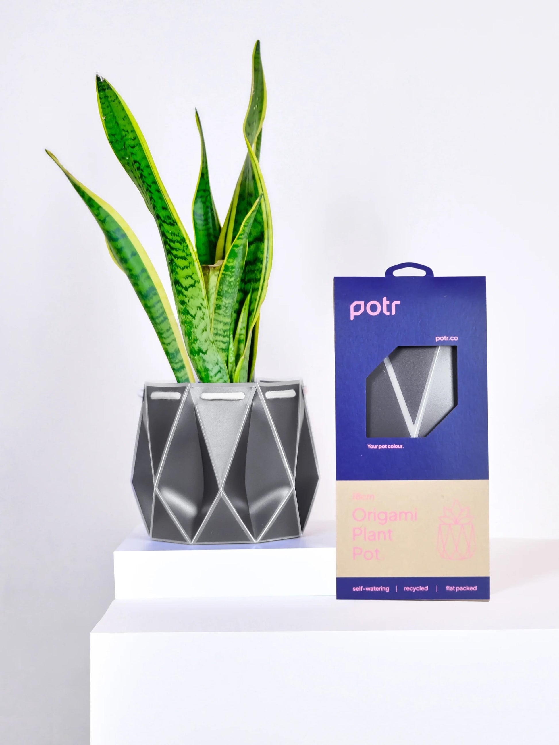 Discover the 7" POTR pot, a sustainable, flat pack, origami self-watering plant pot that uses a specially designed wicking cord to keep your plant hydrated for up to 3 weeks. Made from recycled waste plastic, it reduces material usage by 95% compared to traditional pots. Enjoy the convenience of hassle-free and environmentally-friendly plant care with direct delivery to your letterbox.