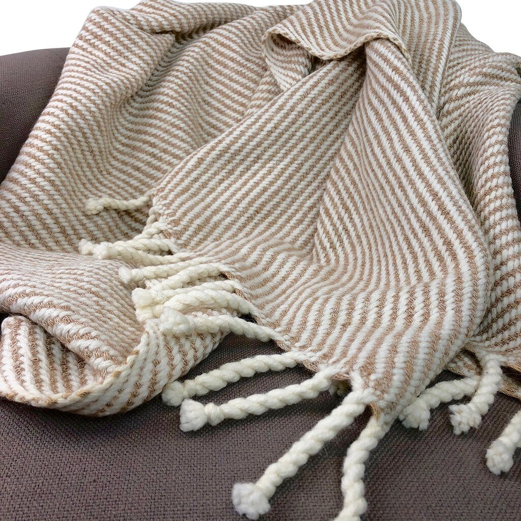 Add texture to your sofa or bedroom with this chunky alpaca throw featuring camel hued stripes. The warmth and luxurious softness of Alpaca wool will keep you comfortable on cold days, and the neutral shades of this throw will go with virtually every color scheme.
