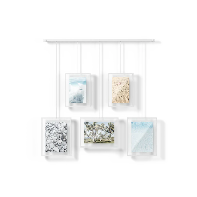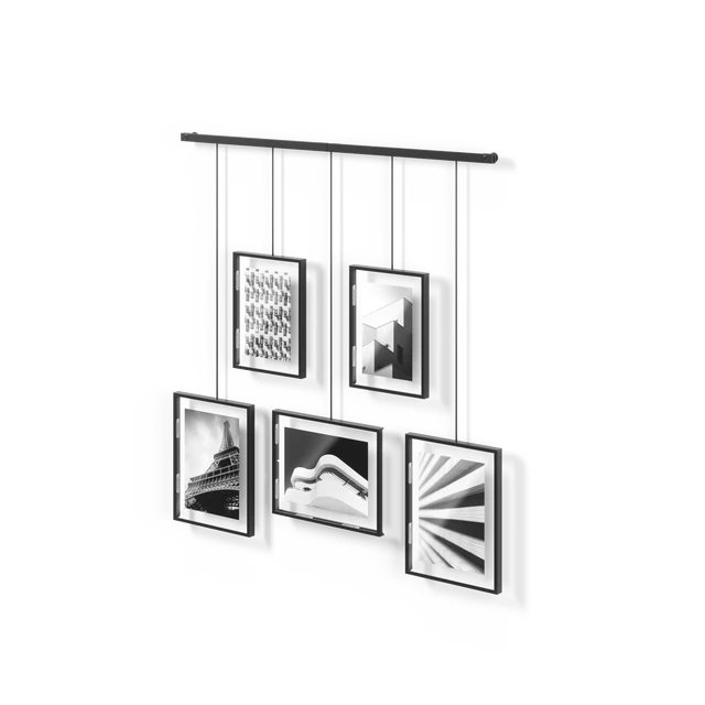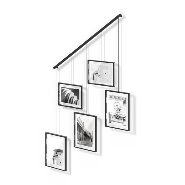Upgrade your wall decor with the Exhibit Photo Display. This sleek, wall-mounted brushed metal ledge is equipped with clips and brackets to securely hold five gallery-style picture frames of various sizes, minimizing wall damage with just two screw holes. The frames are suspended from the ledge, allowing you to create unique layouts, whether hung straight or angled, making it perfect for stairways and other spaces. Ideal for living rooms, bedrooms, entryways, offices, or studios, Exhibit elevates your home's style by showcasing your favorite photos and artwork in a fresh, contemporary manner. Customize the layout by moving the picture frames around and rotating them to landscape or portrait orientation. The set includes two 4x6 frames and three 5x7 frames, allowing you to display cherished memories and illustrations. Exhibit complements any decor style and lets you effortlessly change out images to refresh your room whenever you like.