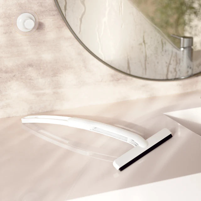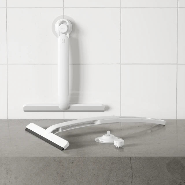 The Flex Squeegee features a handle that extends from 11 ½ inches (29 cm) to 16 inches (40 cm), providing the extra reach needed for cleaning surfaces in your washroom or other areas of your home. This essential cleaning tool comes with a hook that uses Sure-Lock technology for a strong, long-lasting suction hold on your shower surface. Easy to install, it includes non-damaging, waterproof adhesive strips that can be applied to various surfaces such as tiles, drywall, and concrete (not suitable for porous surfaces). The squeegee dries and stores neatly without requiring any drilling. Made from rust-proof, durable material, Flex will stay tidy and fresh in your washroom while maintaining its quality.
