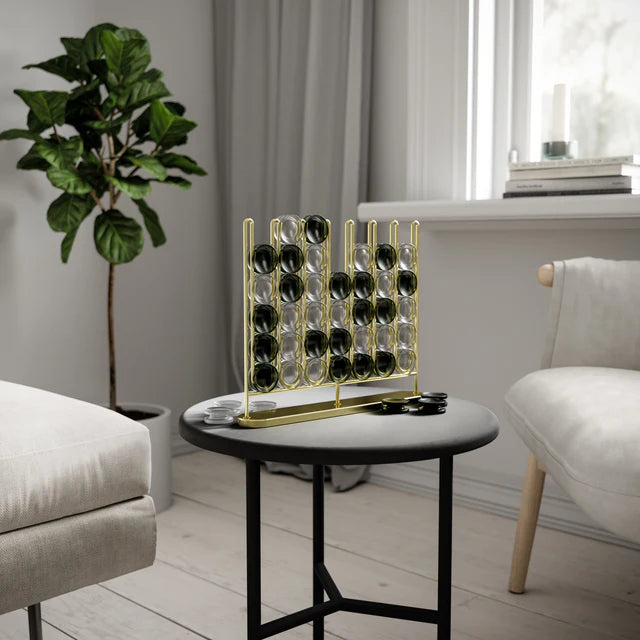 Stax Four-in-a-Row is a fun game for any occasion, suitable for all ages. Featuring a modern brass metal finish and frosted playing pieces, this elevated twist on the classic game doubles as a unique piece of decor for your home. Its eye-catching design looks great on any table or counter space, with a metal wire stopper that keeps pieces in place and adds a decorative touch. Stax Four-in-a-Row combines entertainment with a contemporary aesthetic, making it perfect to display in your living space.