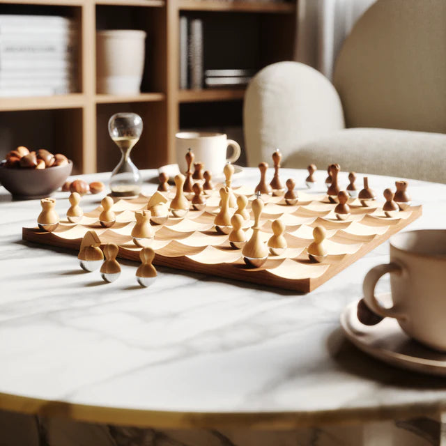 The Umbra Wobble Chess Set’s unique bard design introduces motion to the game, with the weighted playing pieces able to move freely, adding an extra element of challenge and strategy. Its natural wood finish adds a touch of warmth to any room. With its concave landscape, this unique chess set adds a whole new level of excitement to the game, as the freely quivering chess pieces create lively interaction between the board and the pieces. It's the ultimate showpiece for your living room, crafted from beautifully polished maple and walnut wood and sure to delight.